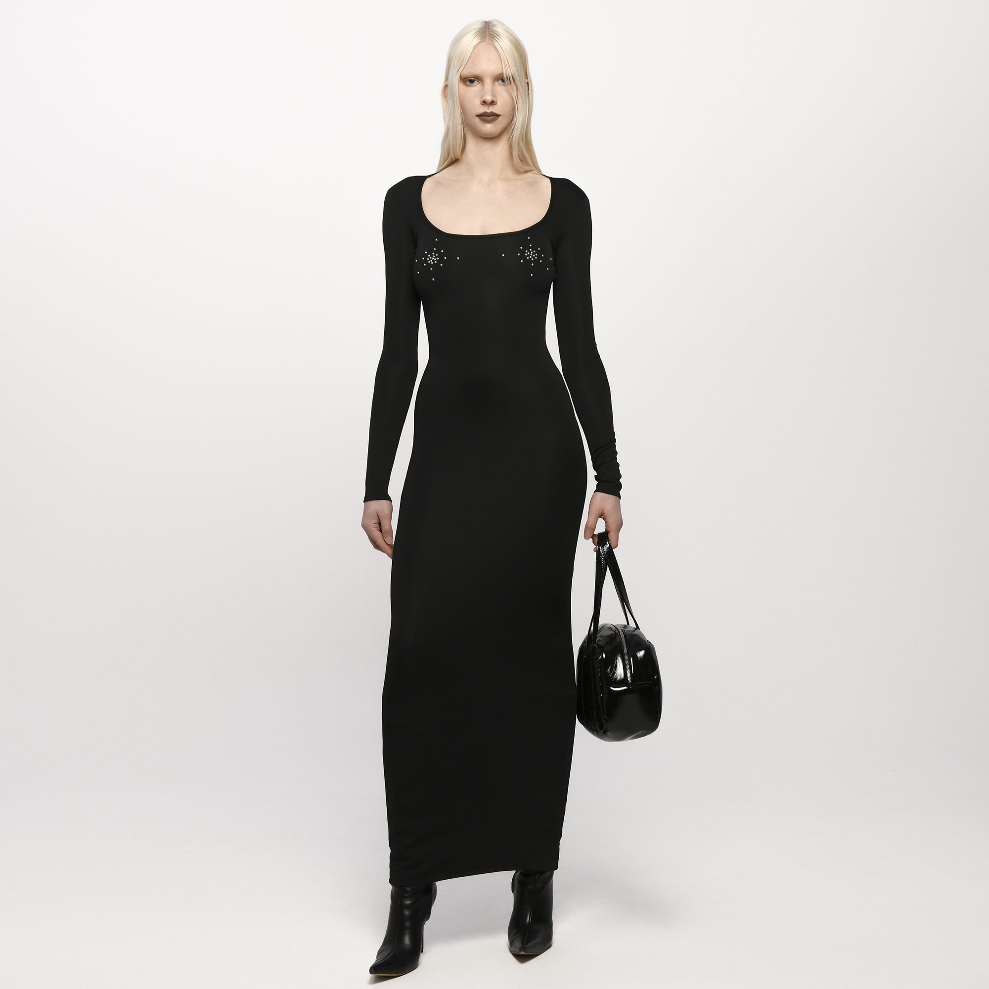 A fitted long-sleeve maxi dress with a clean, minimal silhouette. Subtle crystal embellishments at the chest add a delicate accent. Fits true to size. Take your normal size. Designed and made in Tbilisi, Georgia.