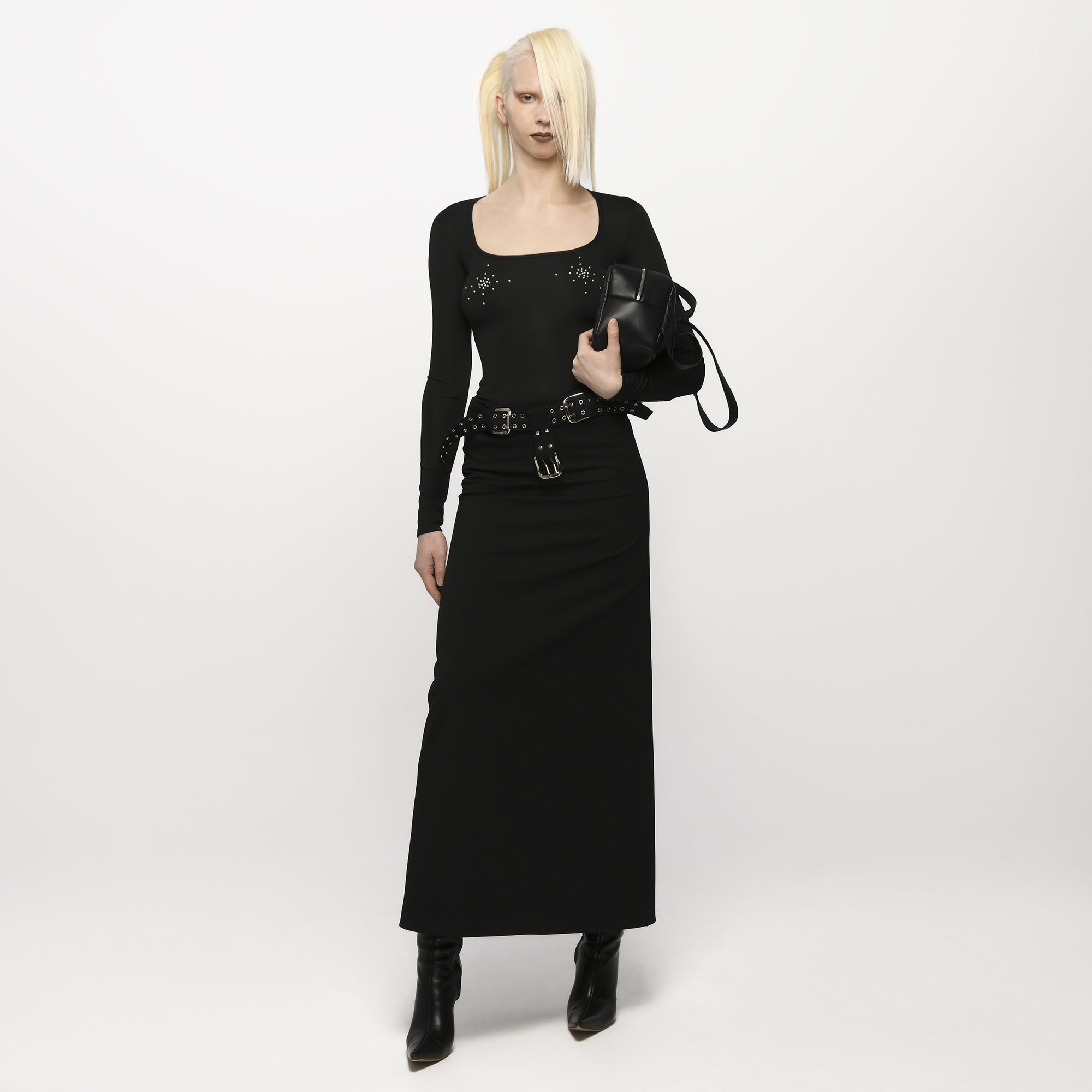 Burlesque top is cut in a fitted silhouette with long sleeves and a clean round neckline. It features delicate crystal embellishments across the chest and is finished in smooth black stretch fabric for a sleek, minimal look. Fits true to size. Take your normal size. Designed and made in Tbilisi, Georgia.