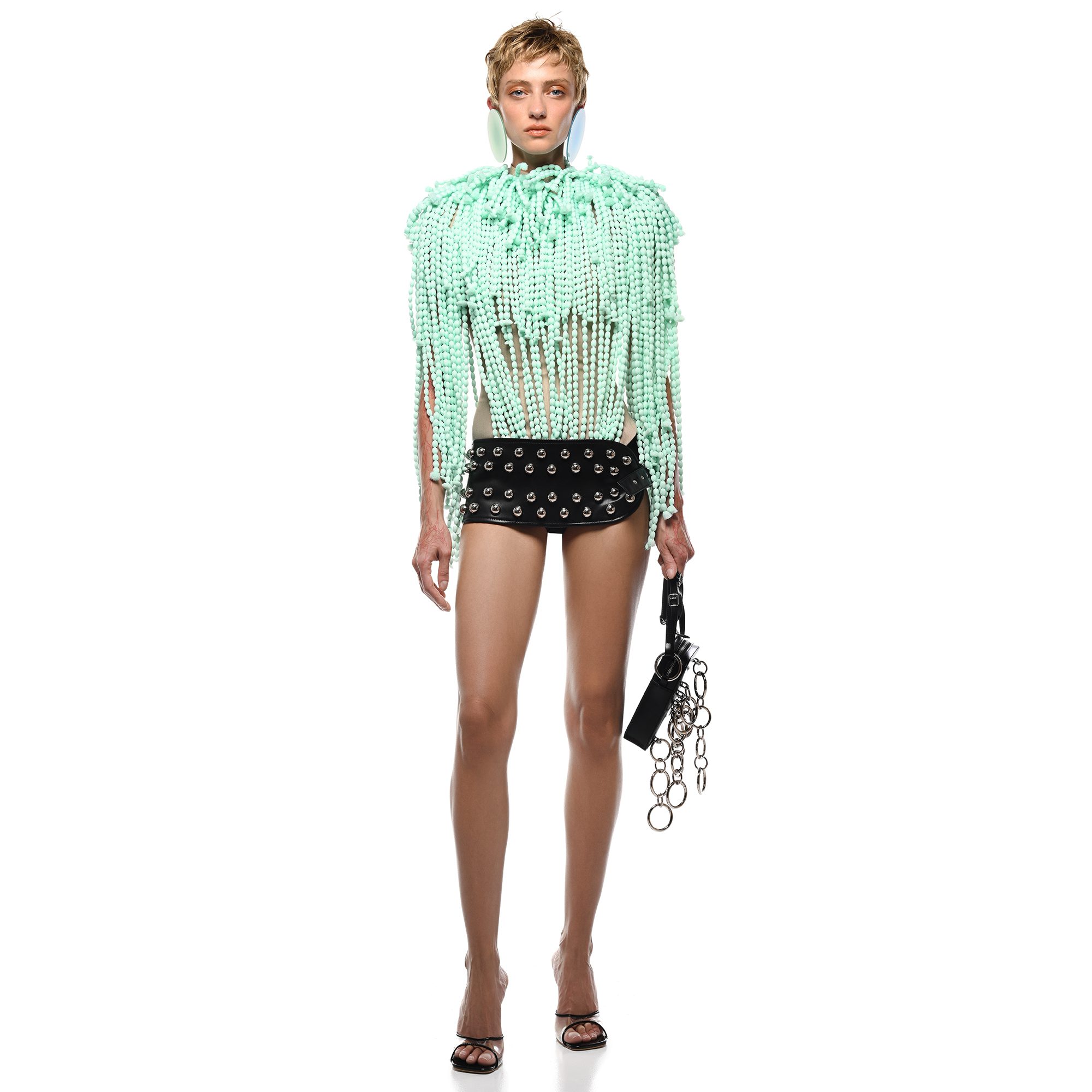 Hail Top is made from many long, knotted fabric strands in mint that fall over the body from the neckline. The strands create the shape and coverage instead of a regular fabric panel. There’s a light base layer underneath. Fits true to size. Take your normal size. Designed and made in Tbilisi, Georgia.