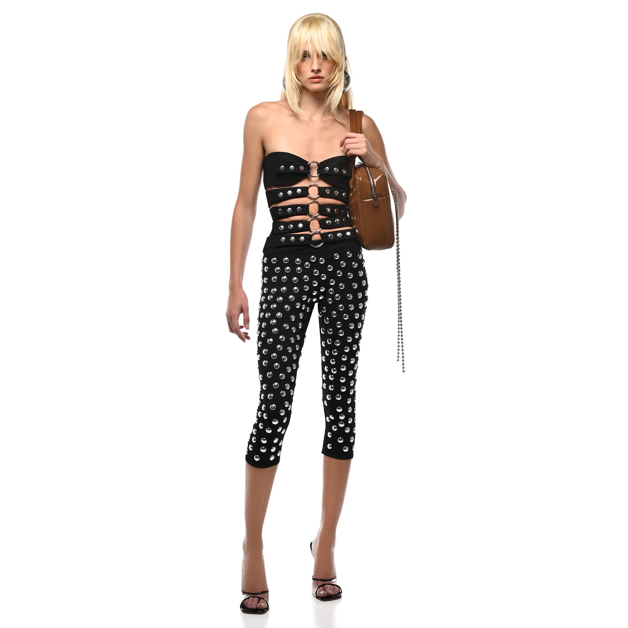 Hyper shibari top is made from stacked bands with metal studs and ring details running through the front. The structure is firm and holds a close fit around the torso. Fits true to size. Take your normal size. Designed and made in Tbilisi, Georgia.