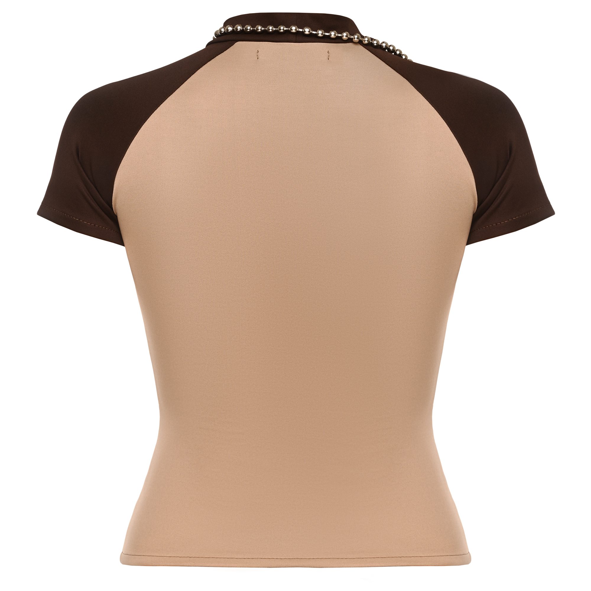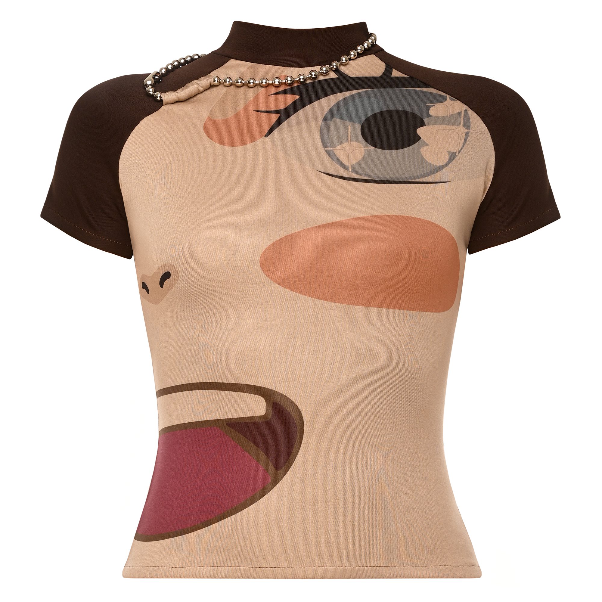 Manga t-shirt is crafted from soft stretch fabric with a fitted, short-sleeved silhouette. Detailed with an abstract face print and a metallic chain trim along the neckline. Fits true to size. Take your normal size. Designed and made in Tbilisi, Georgia.