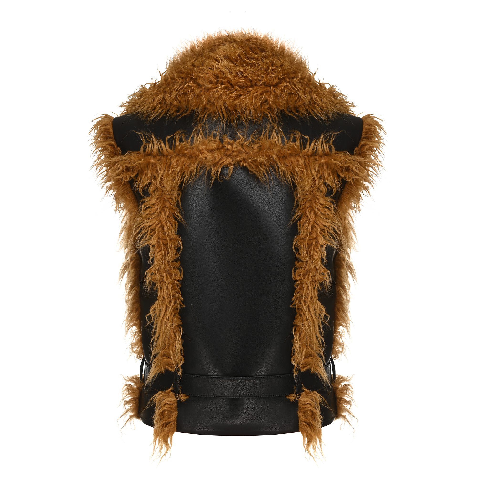 This sleeveless jacket is crafted from vegan leather, trimmed with faux-fur panels and finished with a studded front closure. Fits true to size. Take your normal size. Designed and made in Tbilisi, Georgia.