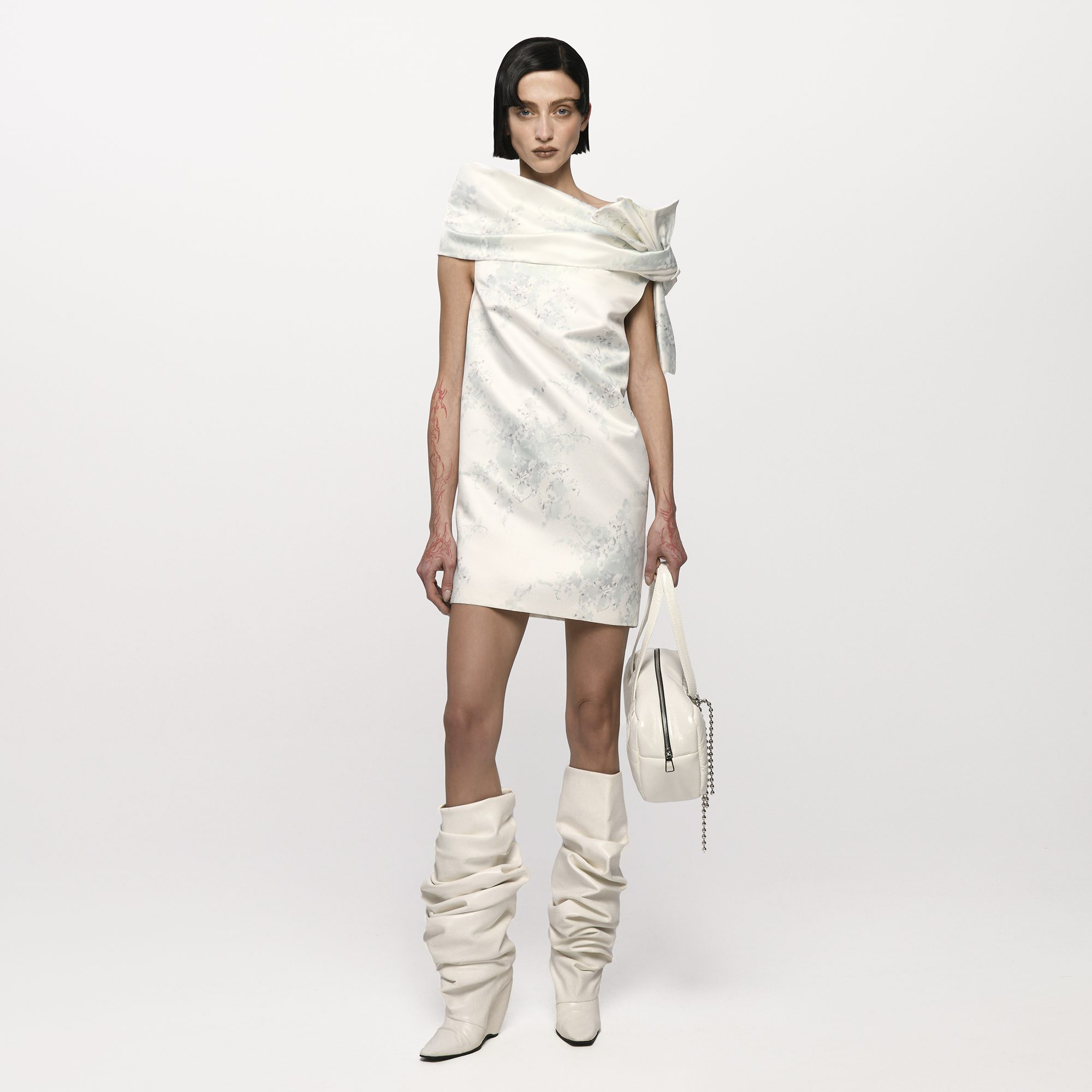 An off-shoulder mini dress in soft printed fabric, featuring a draped neckline with a tied shoulder detail. The fluid silhouette creates an effortless, elegant look. Fits true to size. Take your normal size. Designed and made in Tbilisi, Georgia.