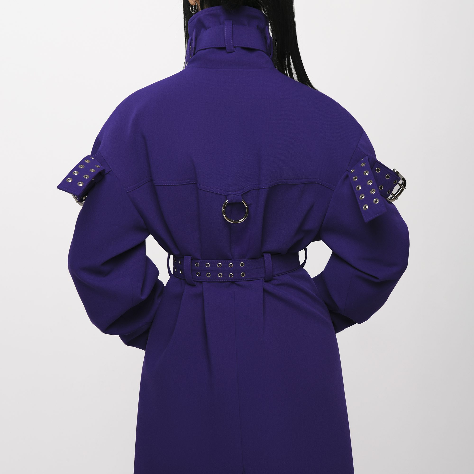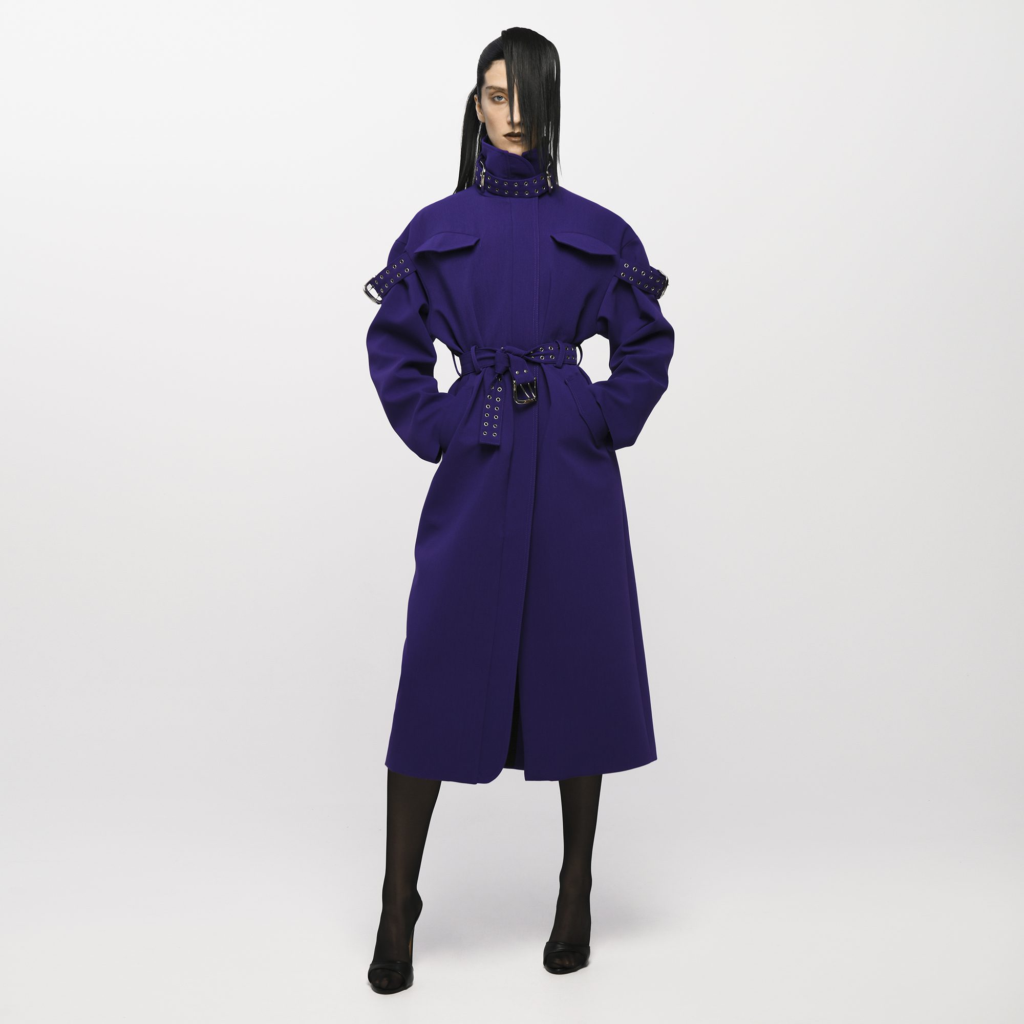 This coat features a structured silhouette with a high neckline and belted waist for a defined shape. Studded strap details at the collar and sleeves add a distinctive edge, while the clean longline cut enhances the sculpted fit. Fits true to size. Take your normal size. Designed and made in Tbilisi, Georgia.