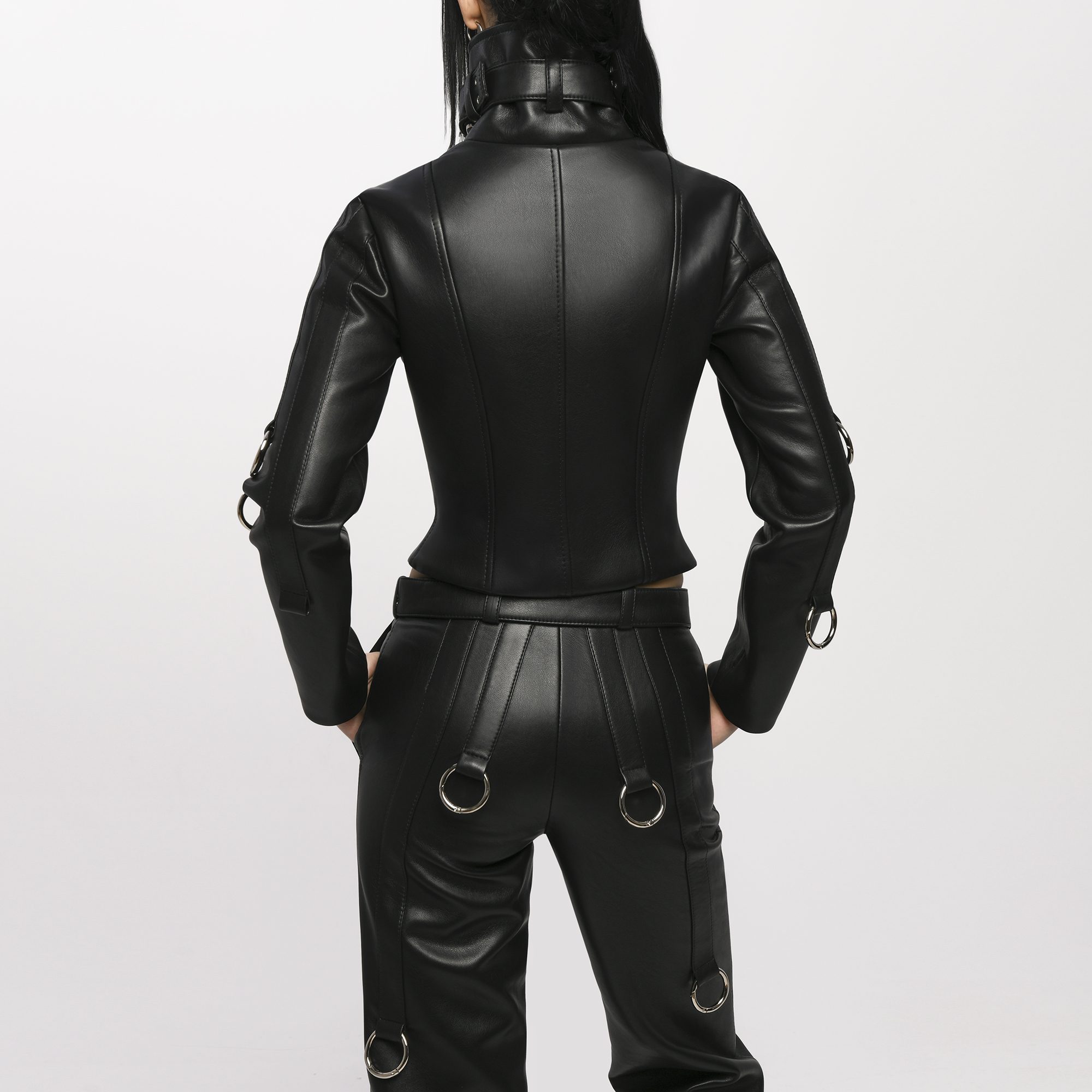 Studded pants are crafted from structured black fabric with a straight-leg silhouette. Detailed with vertical rows of metallic grommets and adjustable strap accents at the hem. Fits true to size. Take your normal size. Designed and made in Tbilisi, Georgia.