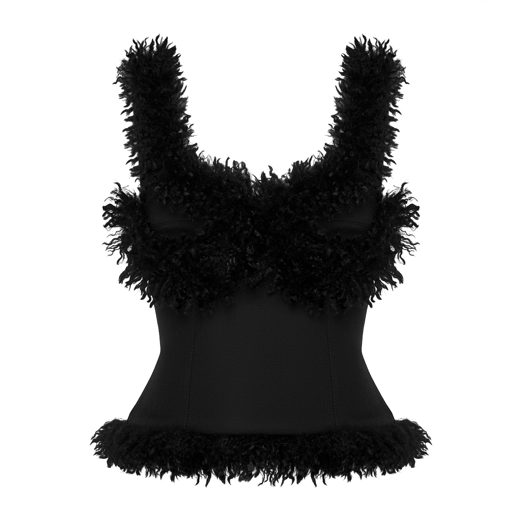Valkiria corset is crafted from stretch fabric and trimmed with plush faux-fur along the straps, bust, and hemline. Fits true to size. Take your normal size. Designed and made in Tbilisi, Georgia.